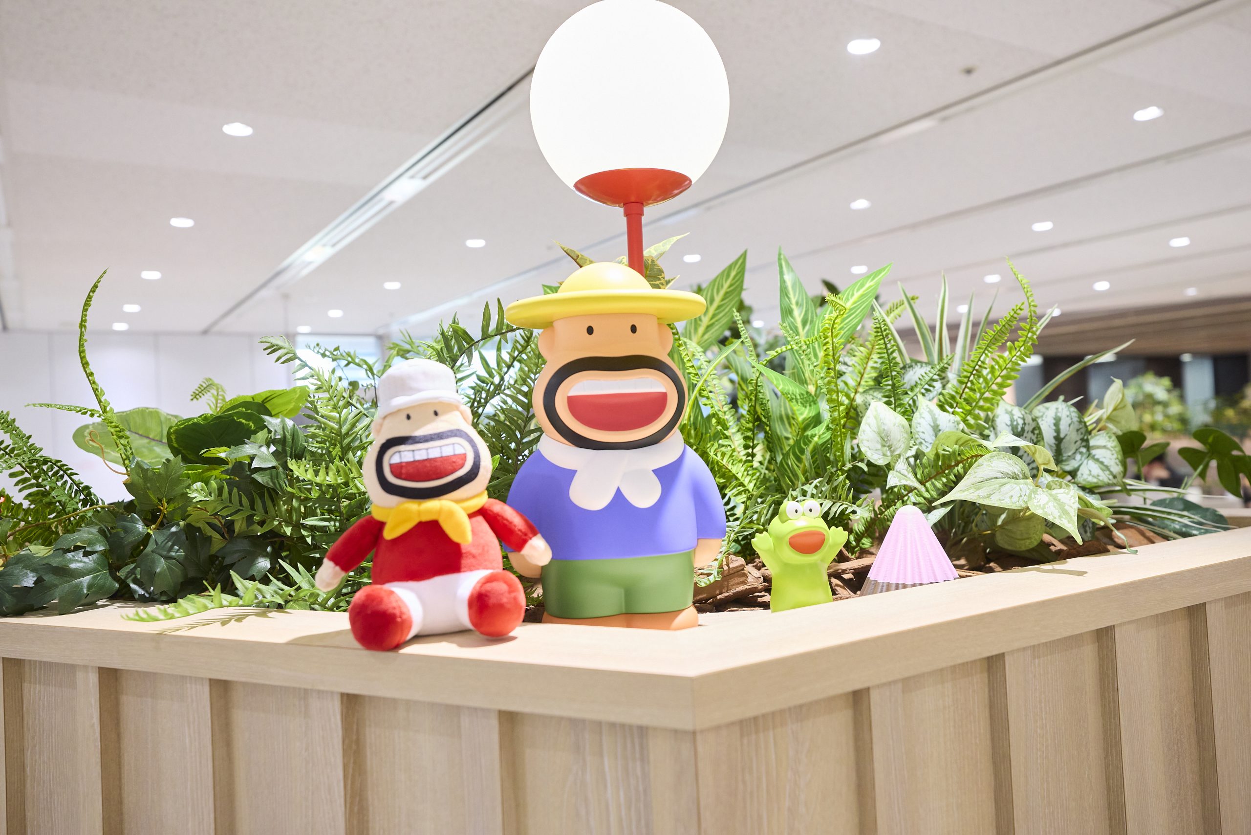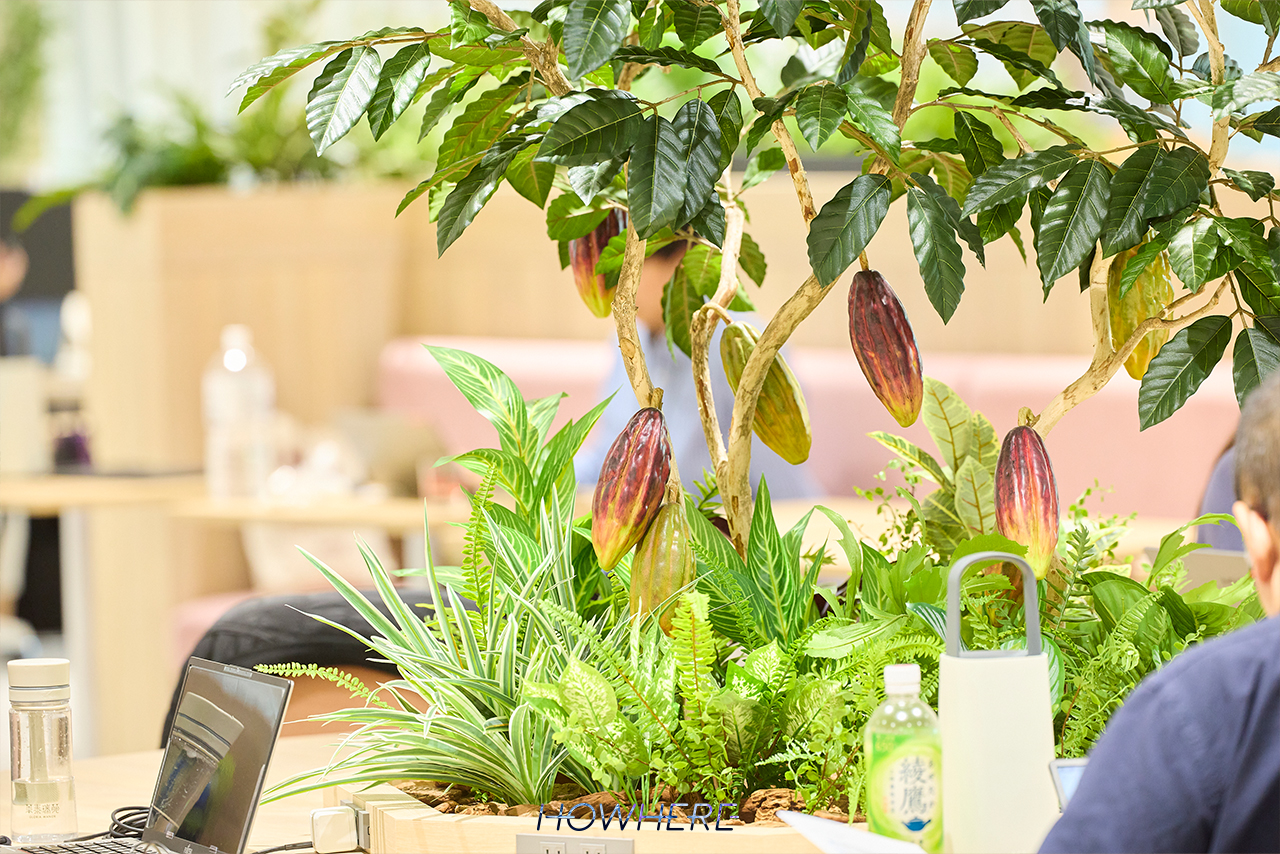 オフィスデザインにもこだわりました。設計業者とのやり取りの中で、「明治らしさって何だろう?」という議論になり、フェイクグリーンのカカオの木を中央に据えたほか、粒チョコレート「アポロ」の形をした照明、「カールおじさん」のマスコットなど、自社商品をモチーフにしたアイテムを随所に配置しました。フロア内の壁には各事業部のモチーフをシンプル化したイラストを描き、身近に感じられるようにしました。特にアポロの照明は完成度が高く、グループ会社からは「うちにも欲しい」と言われるほど好評です。