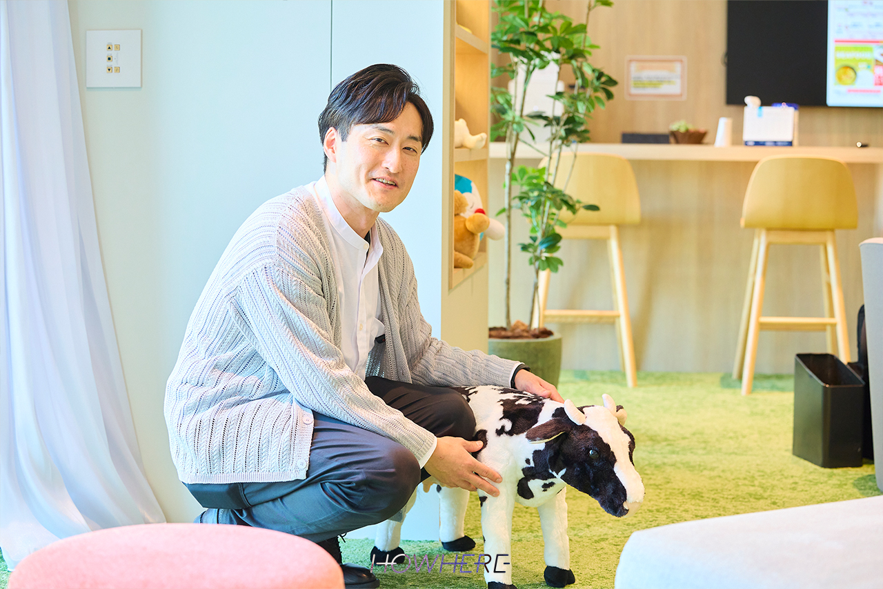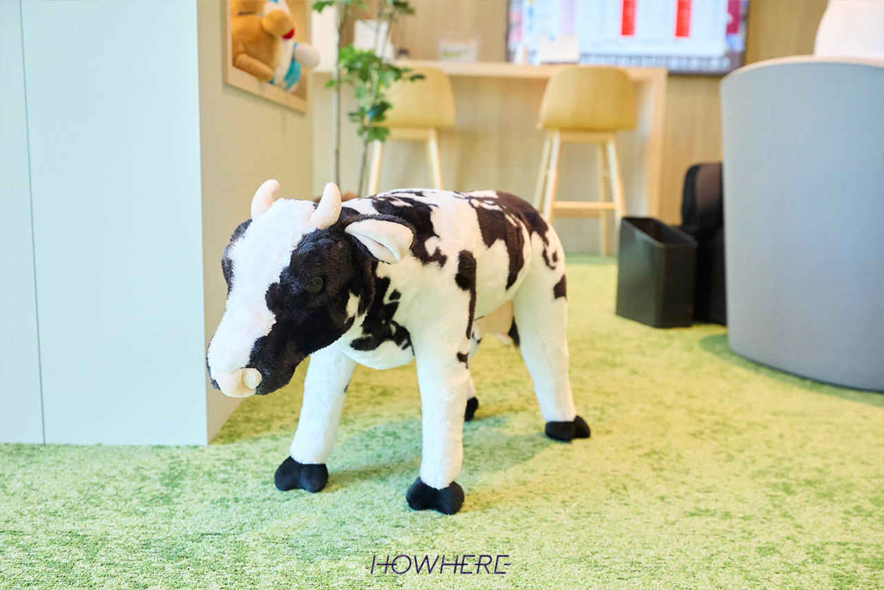 「リラックスエリア」は牧場をイメージして、緑のカーペットを敷き詰め、木目調の家具で統一しました。牛のぬいぐるみを置いて牧場っぽさを出しつつ、可愛いものに触れることで癒される空間にしています。給水機や冷蔵庫も設置し、ちょっと疲れたときに休憩できる場所としても機能させています。